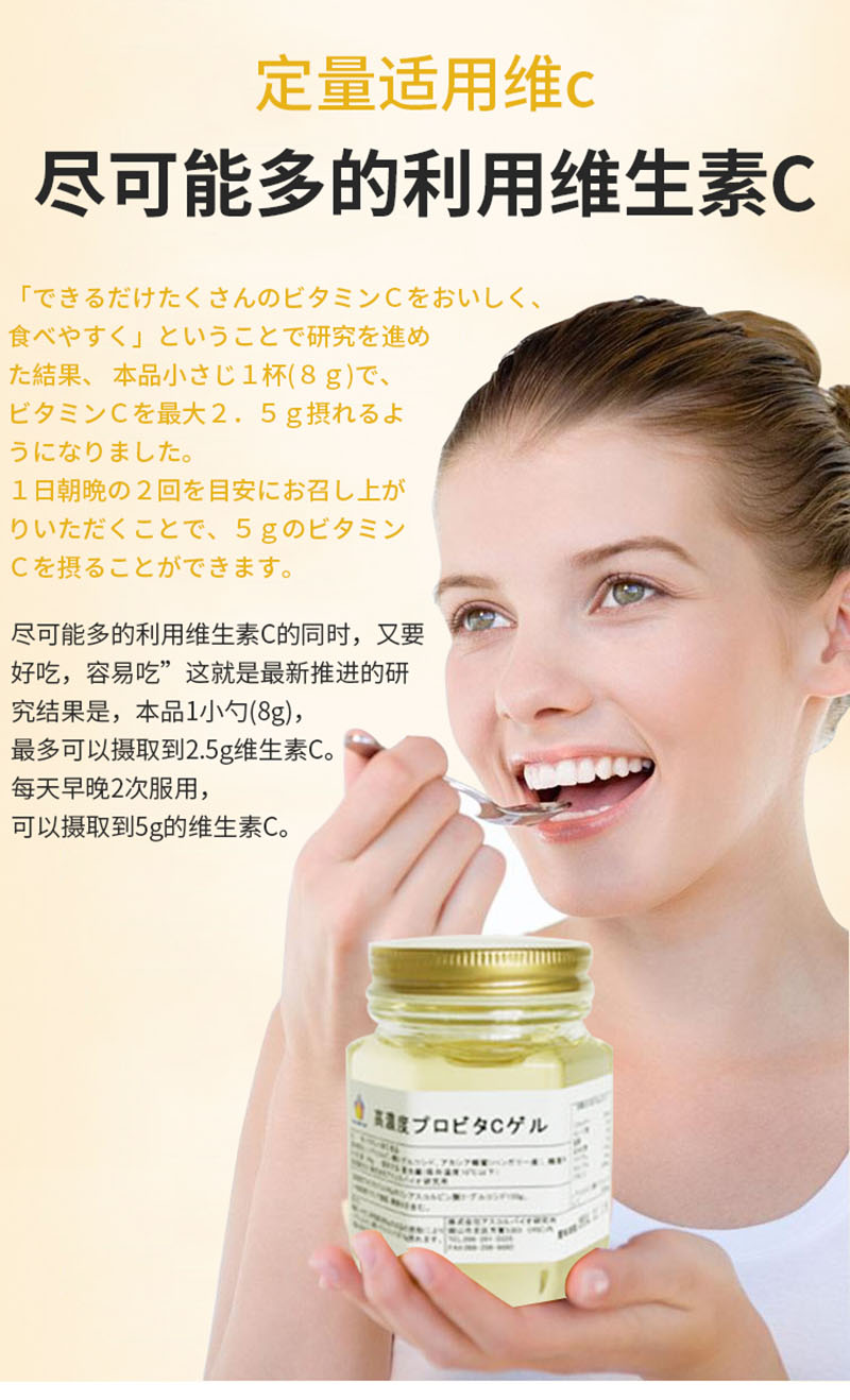 “盡可能多的利用維生素C的同時,又要好吃,容易吃”這就是新推進的研究結(jié)果是,本品1小勺(8g),可以攝取到2.5g維生素C。每天早晚2次服用,可以攝取到5g的維生素C。